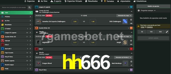 O hh666 oferece uma grande seleção de opções de apostas em e-sports com probabilidades competitivas